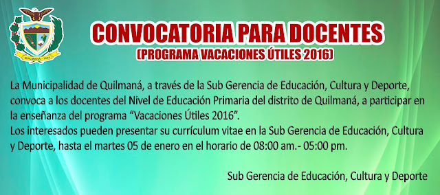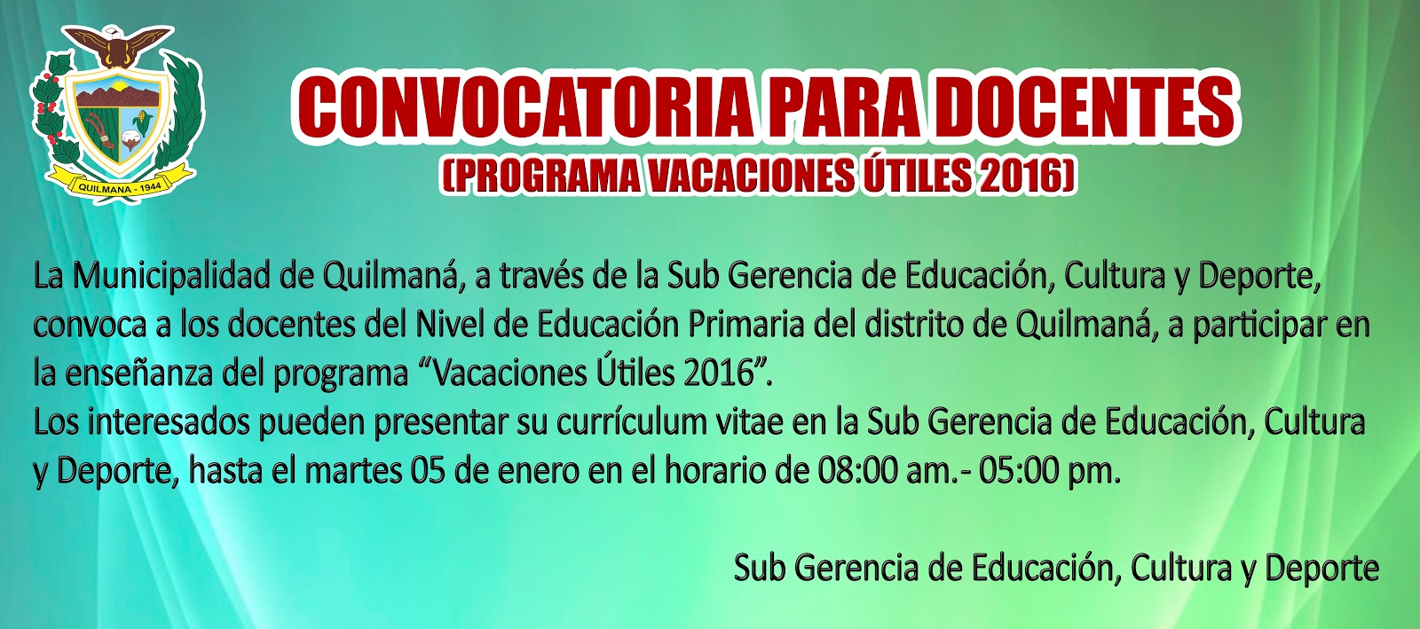 CONVOCATORIA DE DOCENTES DE EDUC. PRIMARIA PARA ENSEÑANZA EN PROGRAMA "VACACIONES ÚTILES 2016"