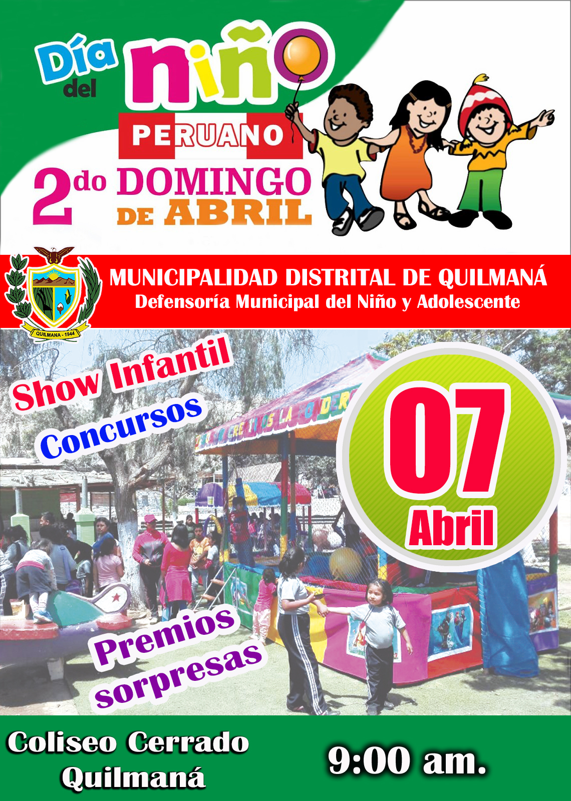 La Municipalidad de Quilmaná, a través de la DEMUNA ha programado la realización de la celebración del “día del niño peruano”, evento que se estará desarrollando las instalaciones del coliseo de Quilmaná, el viernes 07 de abril a partir de las 9 de la mañana.